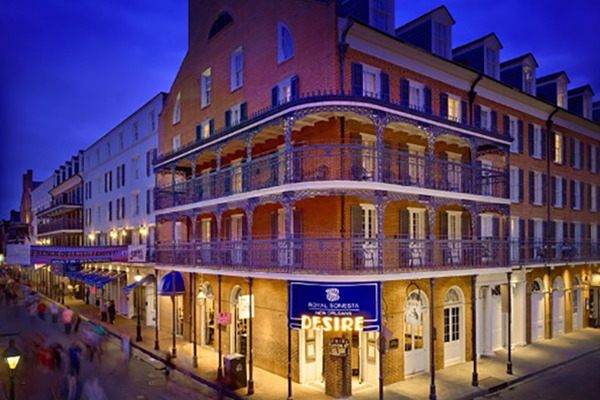 The luxury Bourbon Street Royal Sonesta New Orleans Hotel is in the heart of the French Quarter, minutes away from Jackson Square, the French Market, and Algiers Point. Elegant guest rooms and suites, authentic hospitality, a Food is Art philosophy, wrought-iron balconies, and a lush courtyard create a unique atmosphere of timeless refinement.